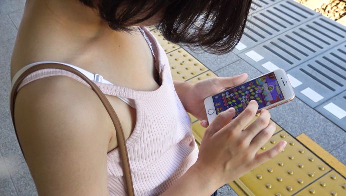 スマホでゲームをしていて腕を寄せたため、さらにブラ(ブラトップキャミ?)が浮かびます。