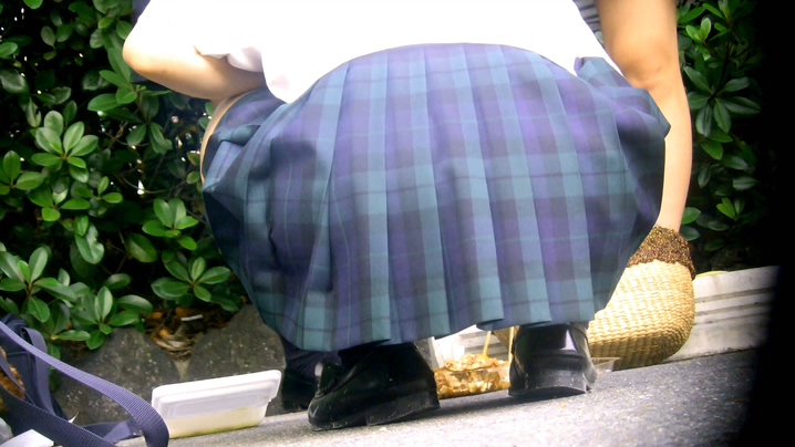 2人目は座って焼きそばを食べているJKです。しゃがんだ後ろから白いものが除く様子を見てください。