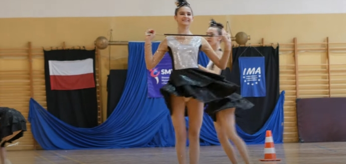 1分18秒あたりで回転バトン投げ受け取りシーンでチラリです。