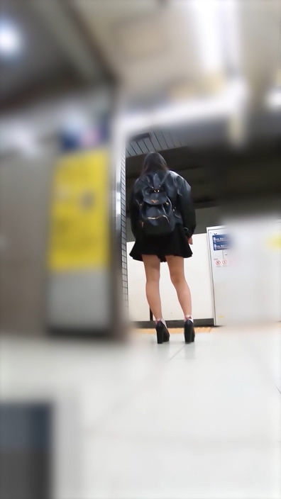 駅構内で電車を待つその後ろ姿へ、ローアングルからそのスカート内へと迫ります。