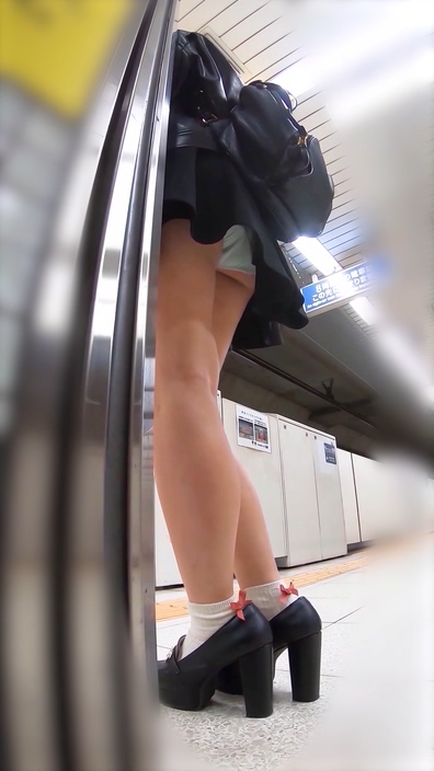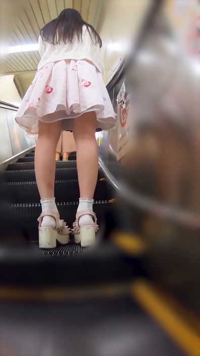 少し暗めのエスカレーターでスカートも黒ということもあってか、少々光量が足りない感じですが、それを補うかのようにカメラを近づけてしっかり白パンが映し出されます。