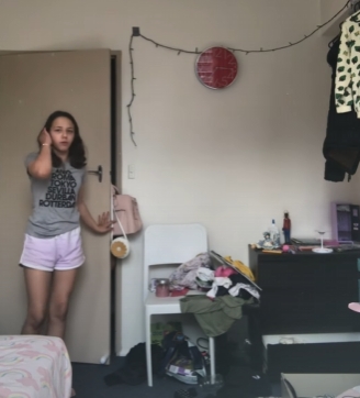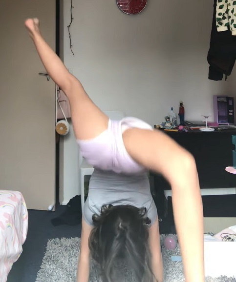白人少女がホットパンツとTシャツという姿で腕立て前転したりする動画です。