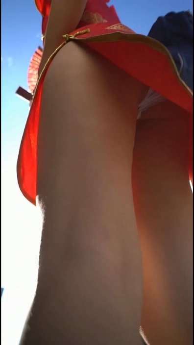風に吹かれたチャイナミニがわずかにめくれて、白のパンツがチラリと見えます。
