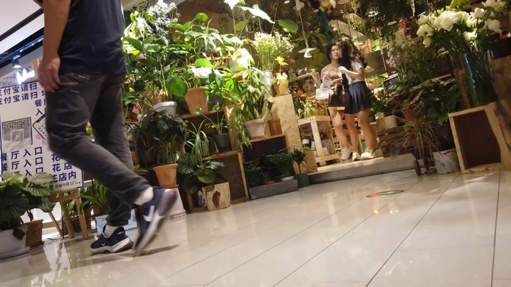 ショッピングモールらしき場所を歩いている2人を前から撮影します。