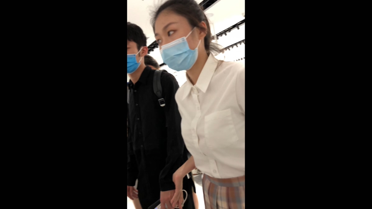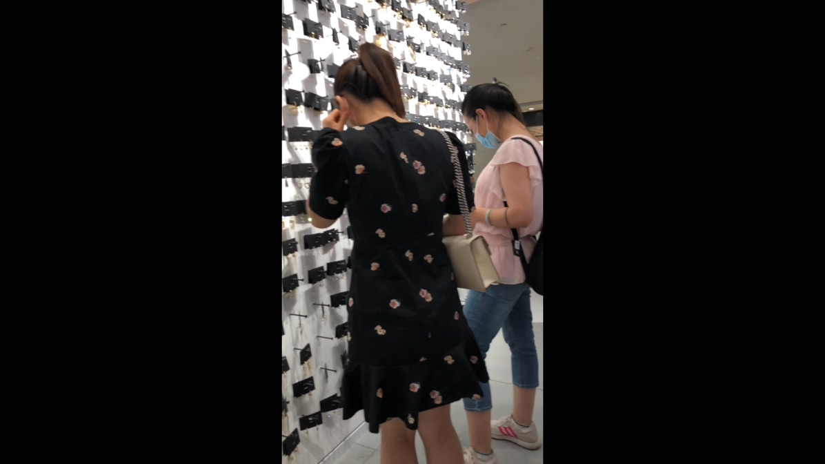 彼氏らしき男性と商品を見ているところを、背後を通り過ぎつつ逆さ撮りします。