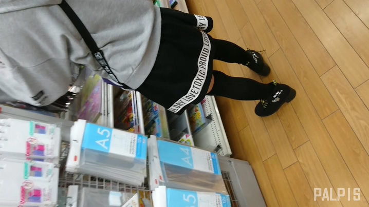 文具コーナーまで来てシールを見ているターゲットの背後へと立ちます。