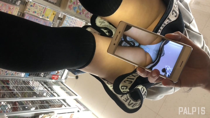 すぐ後ろで屈みこみ、スマホを差し込みながらそっとスカートをめくっていきます。