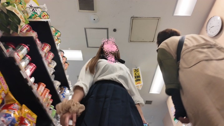 コンビニ店内のレジ列の並びですぐ後ろに付き、じっくりと撮影します。