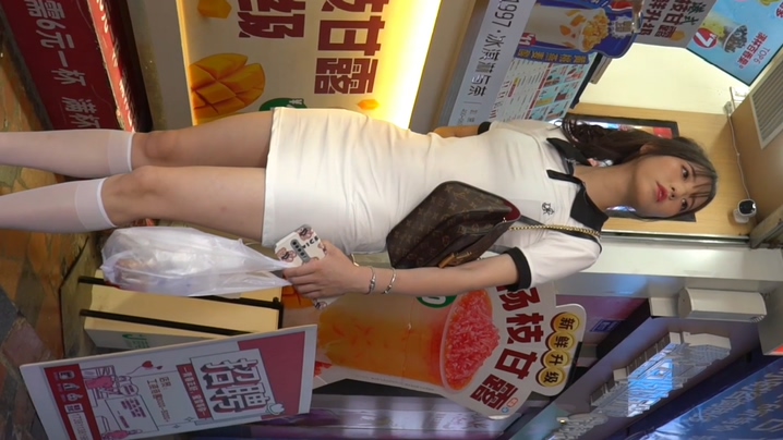 テイクアウト専門のスイーツ店で商品を待っているのでしょうか、タイトなミニワンピース姿の私服女子がお友達と立っています。