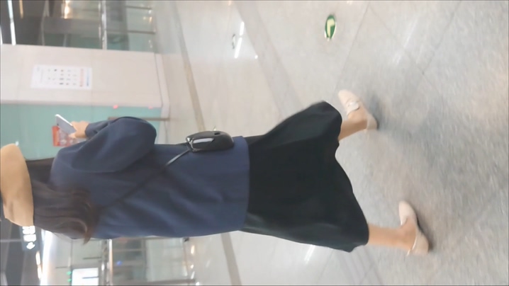 公共施設の構内っぽい場所を歩く、ロングスカートのお姉さんが登場です。